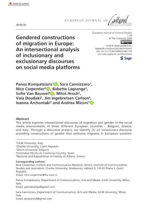 | Articulations of the institutional and the popular in the construction of Europe: A discourse-theoretical analysis of Czech social media content, with Vaia Doudaki, Miloš Hroch, Klára Odstrčilová and Sandra Abdulhaková, Studies in Communication Sciences, 25(1): 47-62.